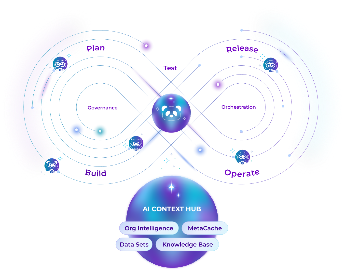 Specialized agents work inside your delivery lifecycle — planning, building, testing, releasing, and operating in coordination.