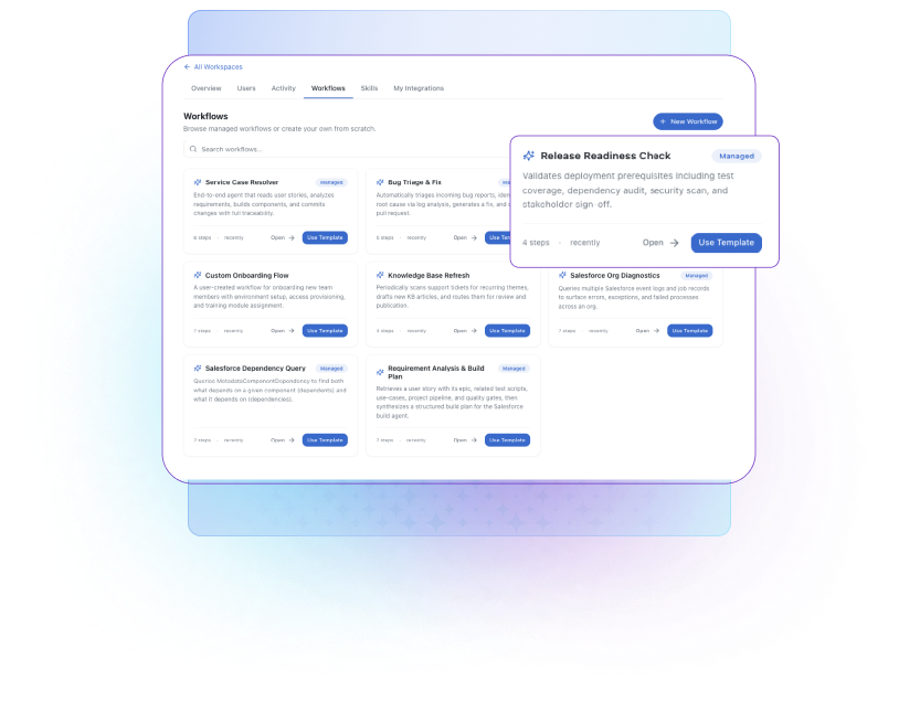Create custom workflows, deploy reusable templates, and govern every step of execution, all in one visual workspace.