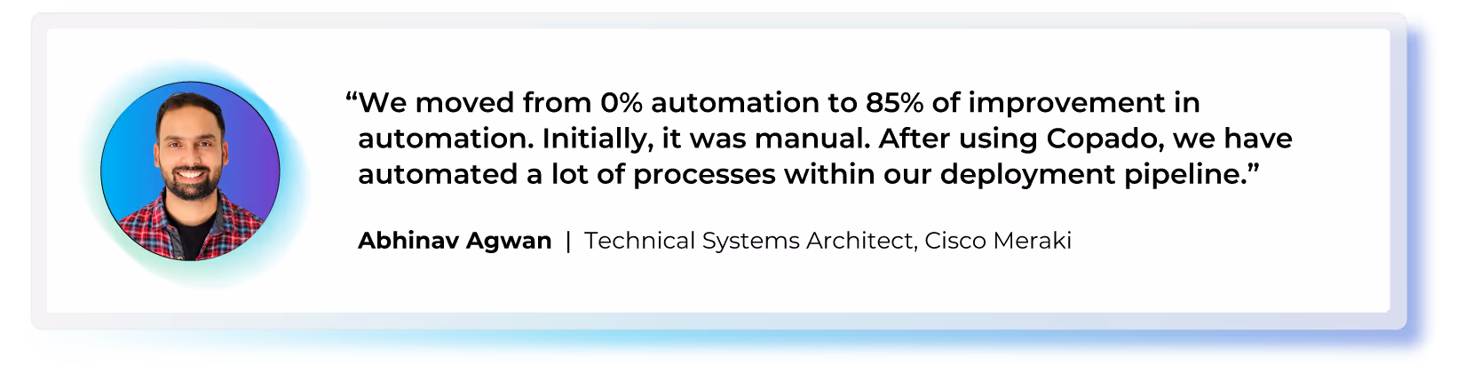 The team faced several critical challenges with their Salesforce deployments, which required 14-16 hours for validation before deploying, often spanning two full days. "We never had a UI on Salesforce that could give us a timeline on how things are proceeding in our deployment pipeline," recalls Abhinav Agwan, Technical Systems Architect at Cisco Meraki.