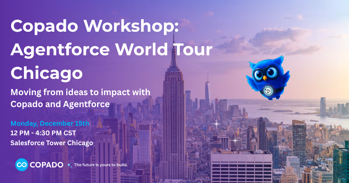Copado kicks off the Agentforce World Tour Chicago on Monday, December 15th, with an exclusive half-day, hands-on workshop, followed by networking with your like-minded peers. Save your spot for this half day workshop offering an afternoon packed with sessions covering topics from AI & Intelligent Automation to hearing from a customer on their efficiency gains and transformation journey.